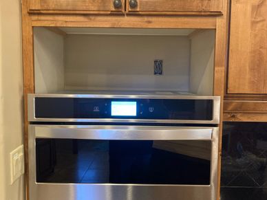 The oven was being replaced in this kitchen, but new sizes were quite different from the old double oven stack. A bottom was added to the leftover cavity and a new door and frame piece were made to match the other cabinetry. The stain finish was custom matched and the new door was installed with gas shocks for ease of use.