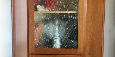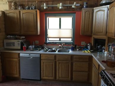 All old oak cabinets in this kitchen were removed and new cherry cabinets with a custom stained finish and a hand-applied accent line on doors were built and installed. New cabinets have function-enhancing features such as the pullout next to the sink designed to accommodate the end users needs.
