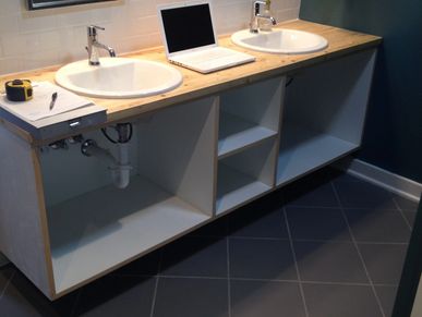 This was a master bathroom double sink vanity that had not been finished. Custom doors were designed, painted to spec, and installed. Drawer boxes with custom fronts were constructed, painted to spec, and installed.