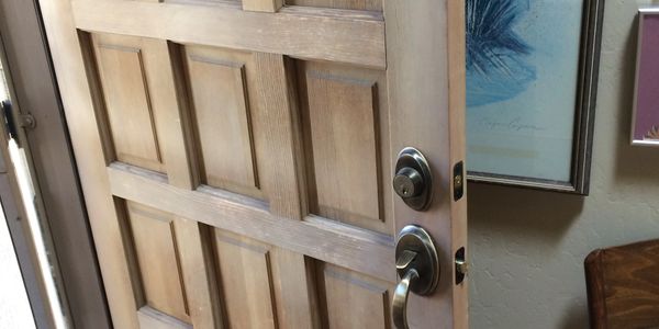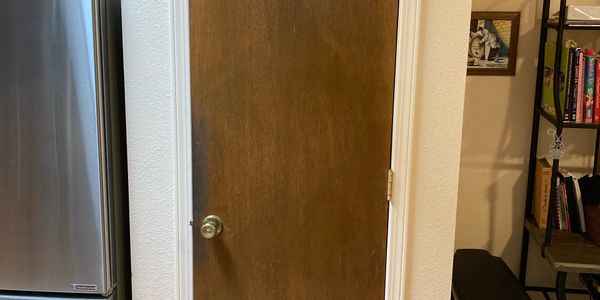The old hollow-core doors were aged and a slightly lighter stained finish was desired. The homeowner also wanted a different hardware color with handles instead of knobs for easier operation. A new solid core door with custom stain was installed with new hinges and handle in the existing panty opening.