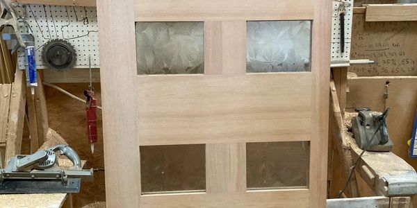 The homeowner wanted a more contemporary styled front door with a stained finish that matched other woodwork in the house. This beautiful fir door was stained to match and installed in the existing opening.