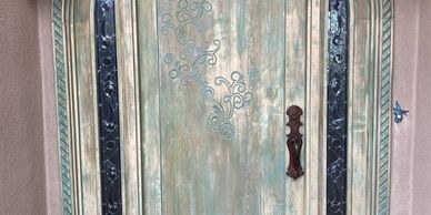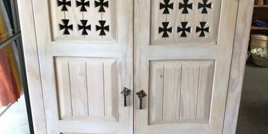This traditional New Mexican cabinet had an original whitewashed finish that needed some repair. The owner of this piece requested a change of color. All work on this project was completed by hand resulting in a soft patina and warm new color and finish.