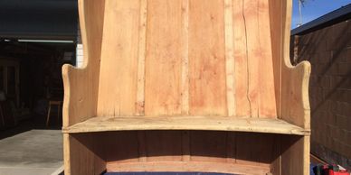 This unique pine bench had been outdoors for years and suffered damage from sun and rain. It was sensitively repaired to preserve some of the distinguishing wear marks obtained over the years. It was stained and top coated to bring out the beauty of the piece.